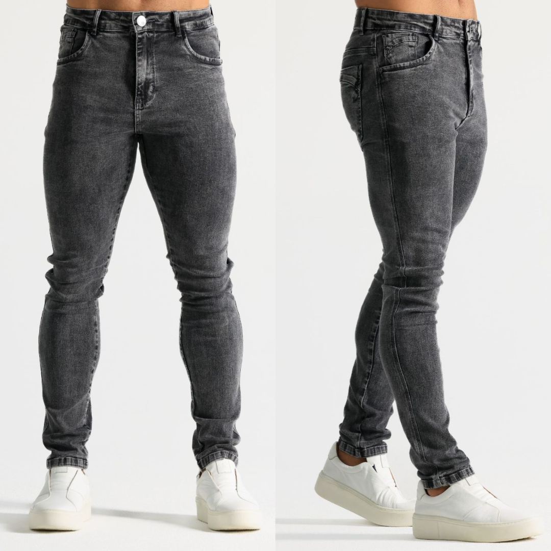 Calça jeans slim masculina preta marmorizada com recortes que transformam seu look. Com 98% algodão e 2% elastano, oferece conforto, estilo e caimento perfeito. Seu novo jeans favorito te espera!